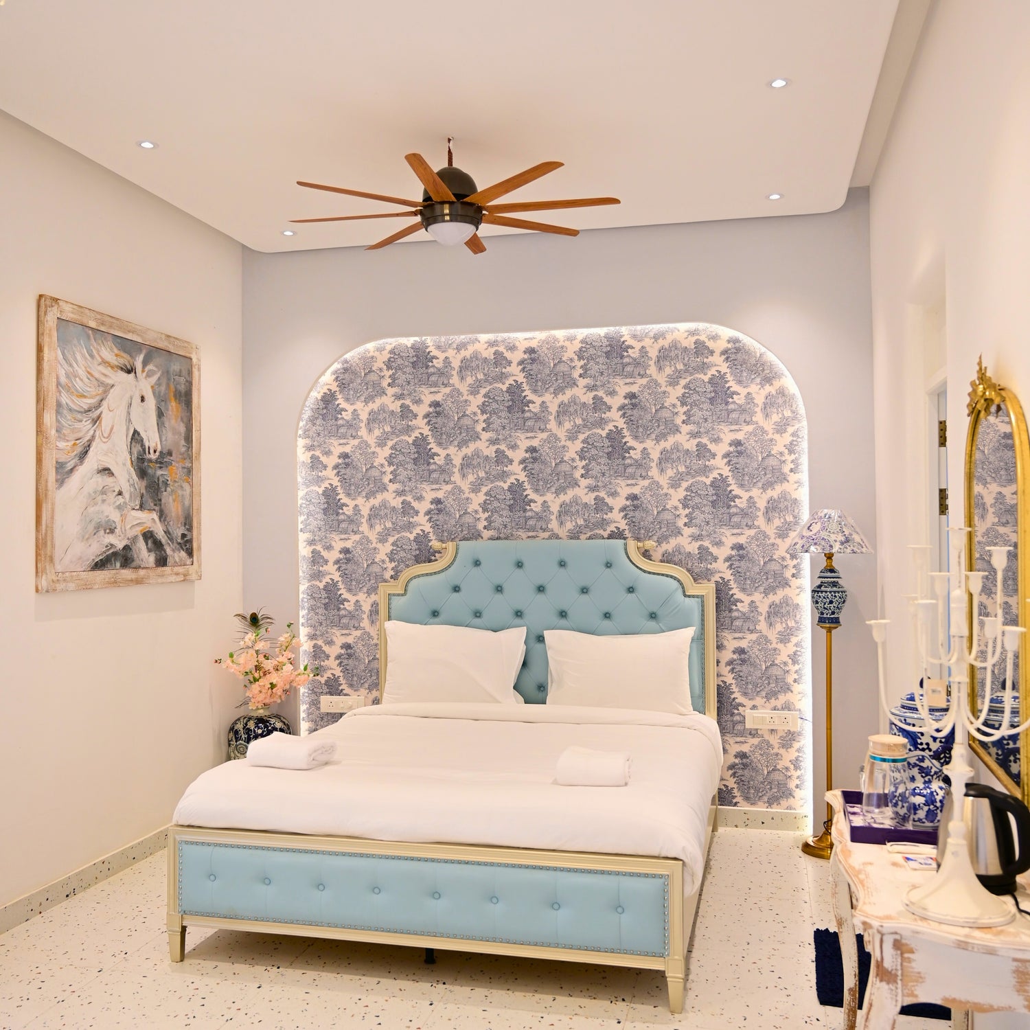 Our Classic Santorini Rooms are inspired by the pure Greek island aesthetic whitewashed walls, soft blue accents, curved designs, and a clean, relaxing ambience. These 6 rooms offer a simple, elegant, and refreshing environment ideal for families, couples, and anyone who prefers a peaceful stay. With beautiful natural light, European style décor, and photo-friendly corners, these rooms give you a calming Santorini feel without leaving Anaikatti.
