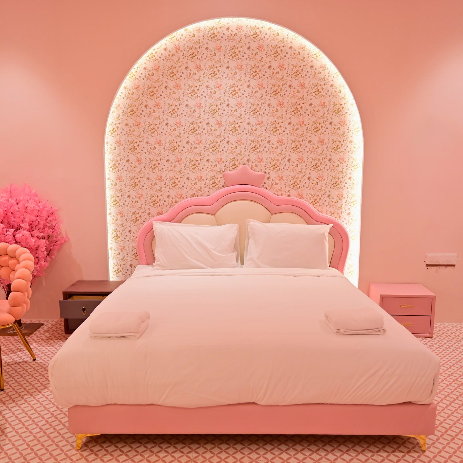 Our Barbie Themed Rooms are designed as dreamy pink escapes, filled with blush interiors, rose-gold accents, soft lighting, and picture-perfect décor. These rooms are crafted for guests who love a playful yet premium vibe ideal for girls’ trips, birthday surprises, couple stays, content shoots, and anyone who wants a fun, aesthetic, and luxurious experience. All 6 rooms maintain a consistent pink fantasy theme that feels magical the moment you walk in.