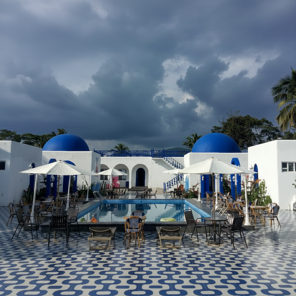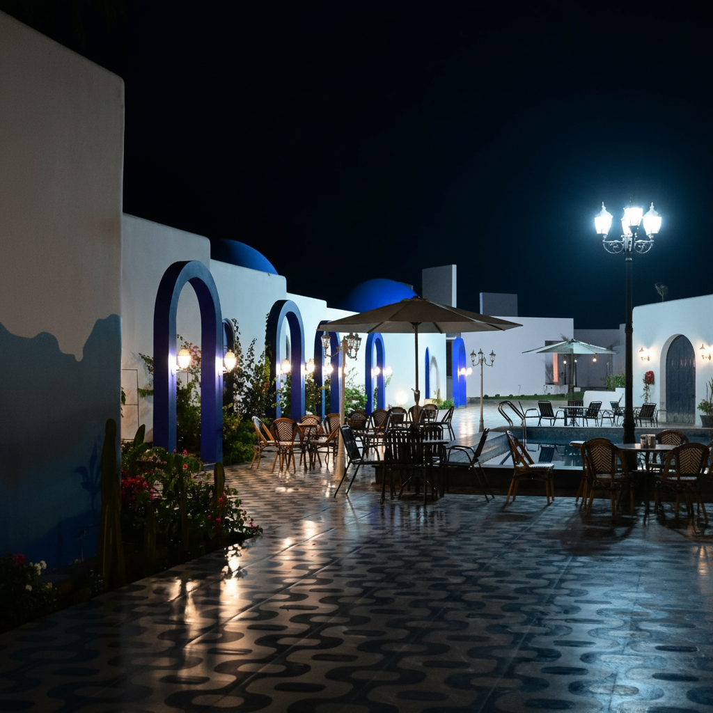 Greece in Blue Resort is a European-themed luxury getaway nestled in the calm, breezy hills of Anaikatti. Inspired by the iconic blue–white charm of Santorini and the elegance of Roman-style architecture, the entire resort is designed to feel peaceful, aesthetic, and romantic. From whitewashed walls to arch-shaped interiors, every corner gives you the feel of a real Greek island escape right here in Tamil Nadu.